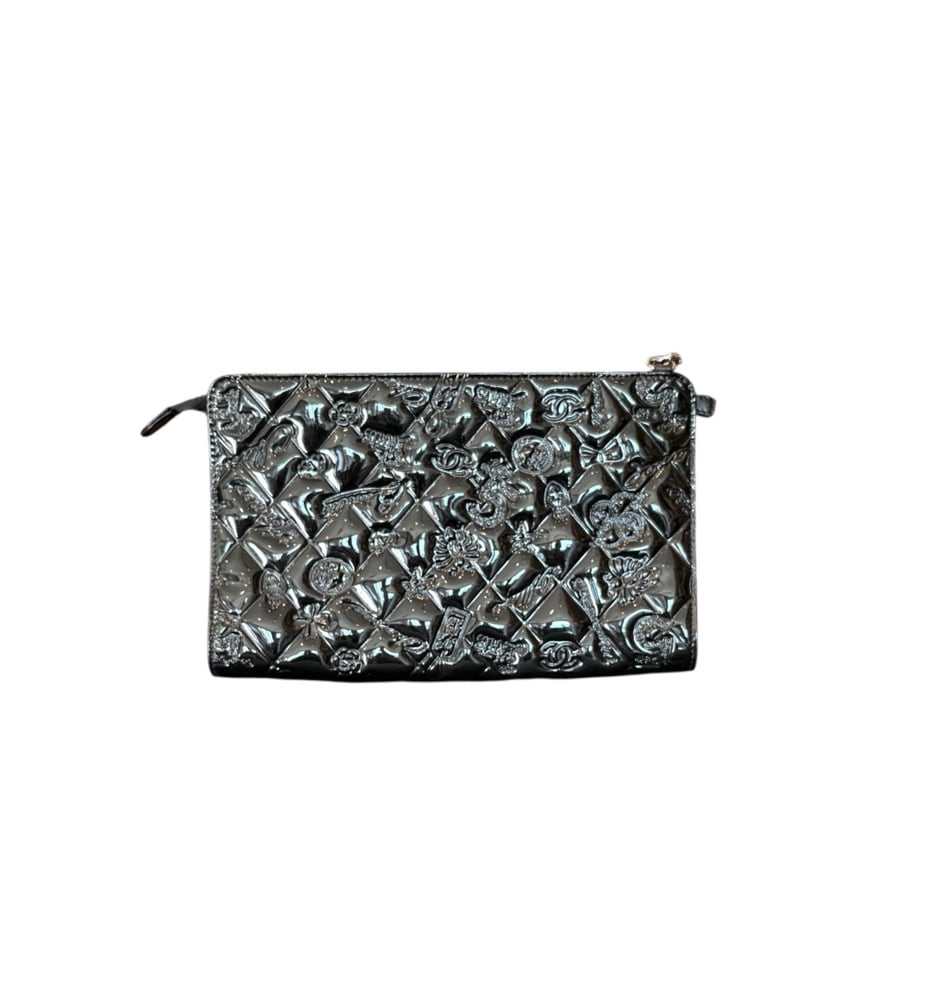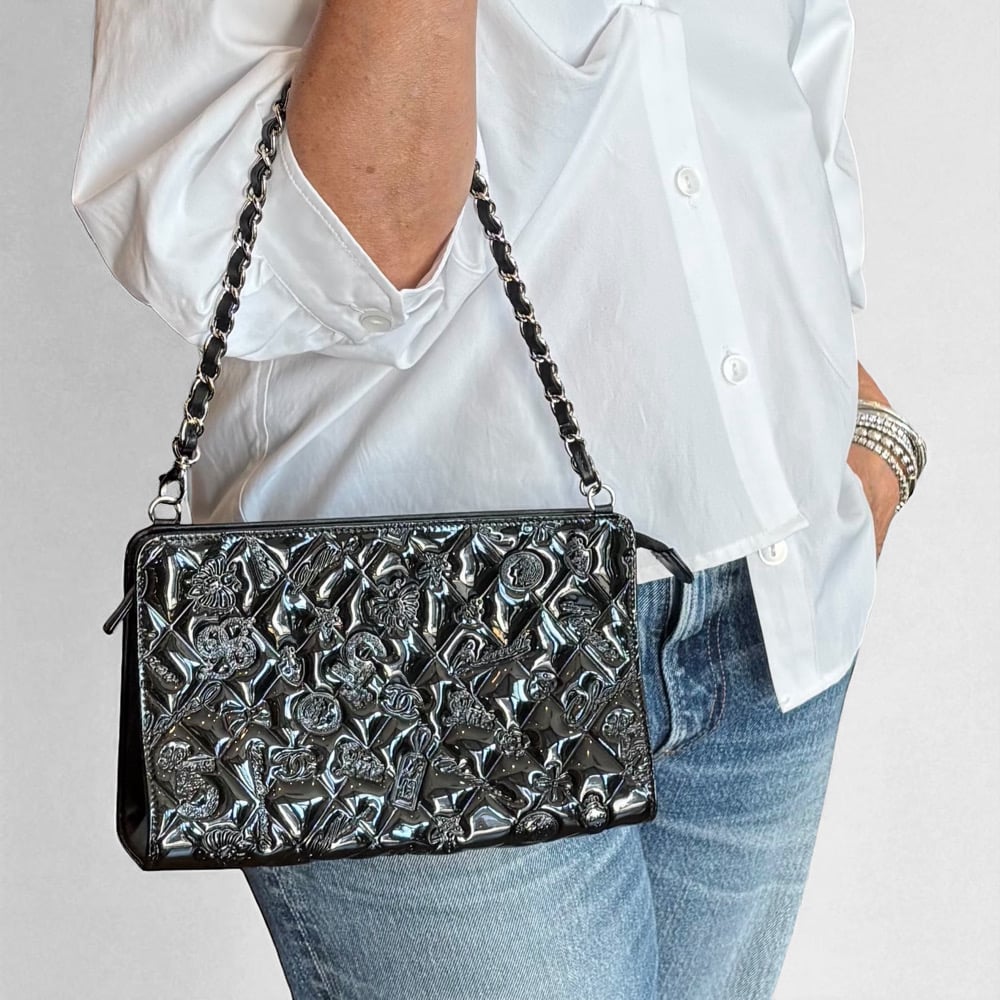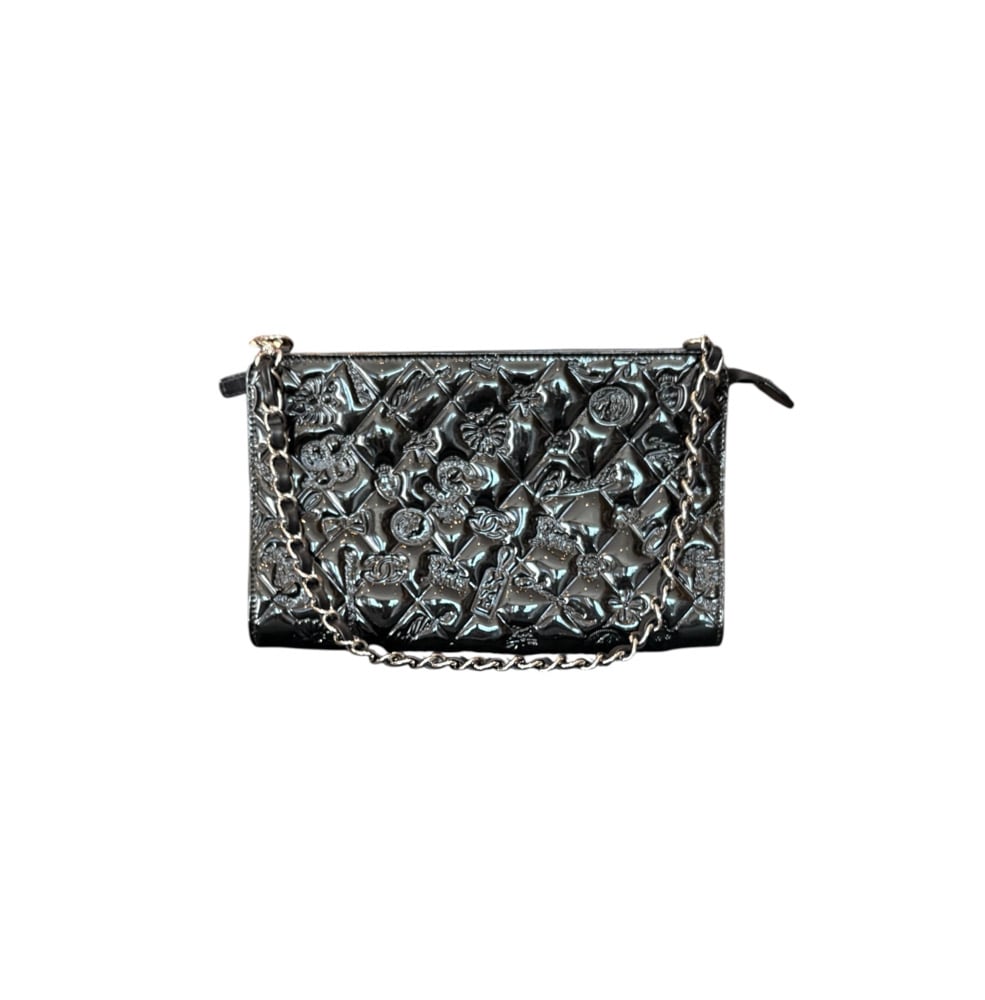 Chanel black Patent lucky symbols handbag. With silver hardware. In excellent condition.