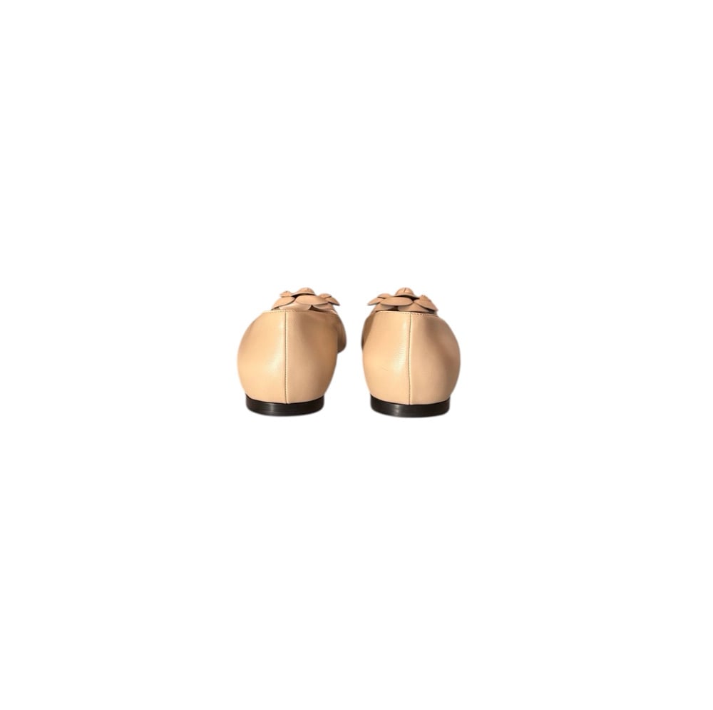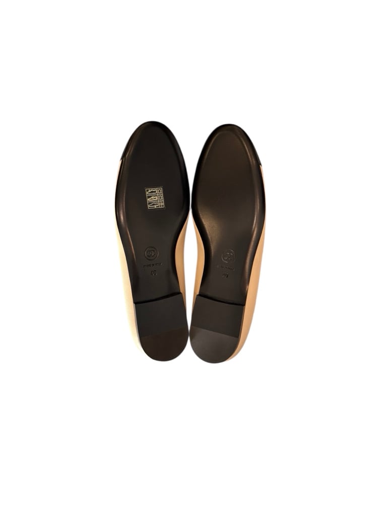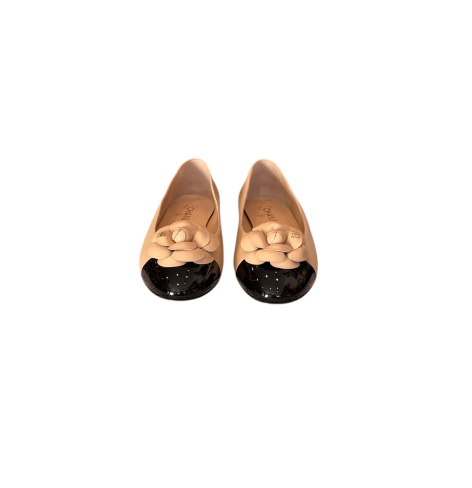 Chanel beige/black camellia cap toe flat shoes. In pristine, never worn condition.