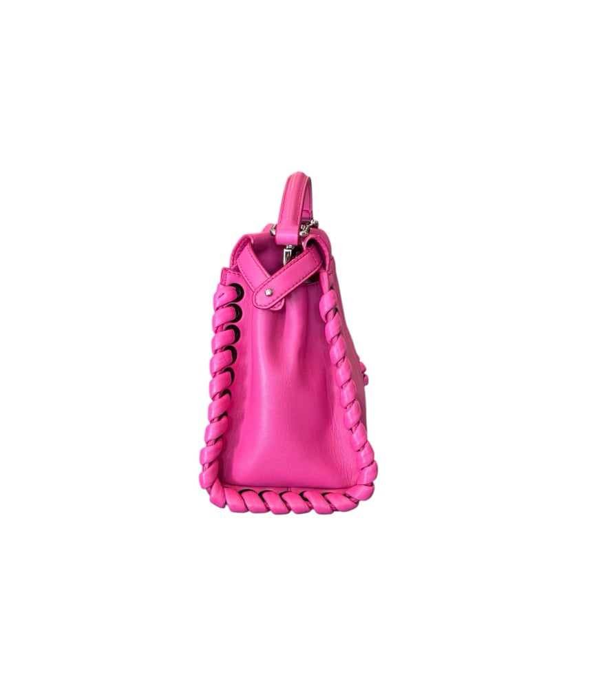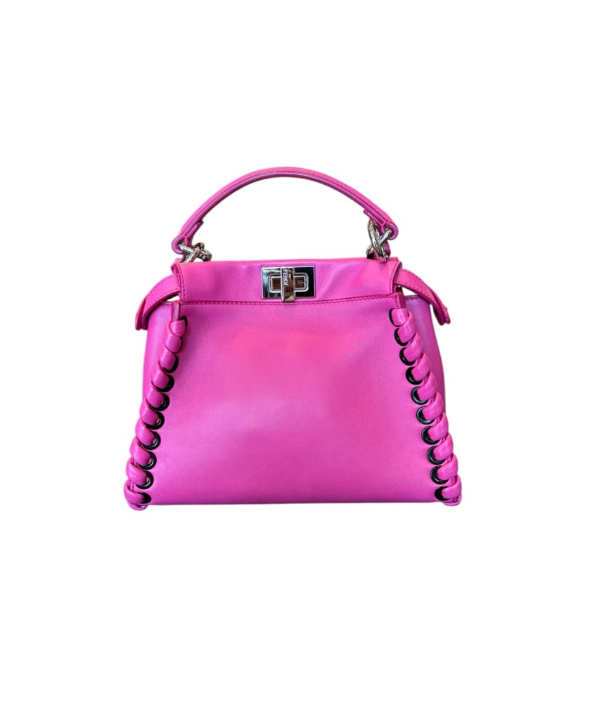 Fendi fuchsia, mini peekaboo handbag with crossbody strap. With dust bag. With silver hardware. In pristine, barely used condition.